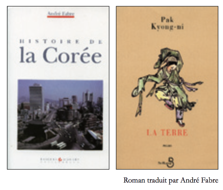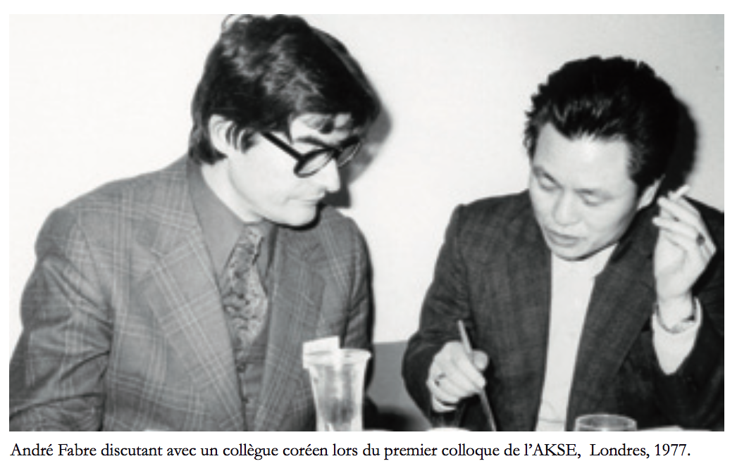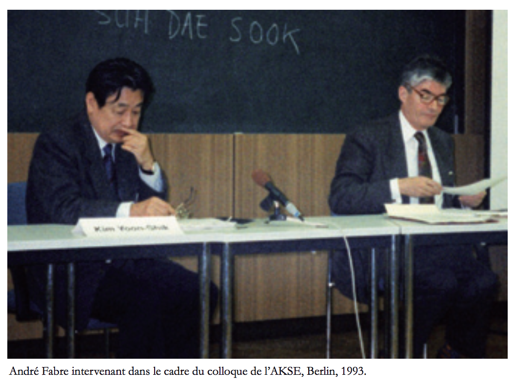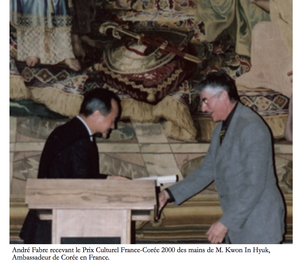 Rappelons qu’André Fabre occupa diverses fonctions administratives à l’INALCO et qu’il fut notamment président de l’AKSE (Association for Korean Studies in Europe) de 1987 à 1990. En 2000, lui fut aussi attribué le prix culturel France-Corée pour une meilleure connaissance en France de l’histoire de la civilisation du Pays du matin calme. Ce prix lui fut remis par M. Kwon In Hyuk alors ambassadeur de Corée en France.