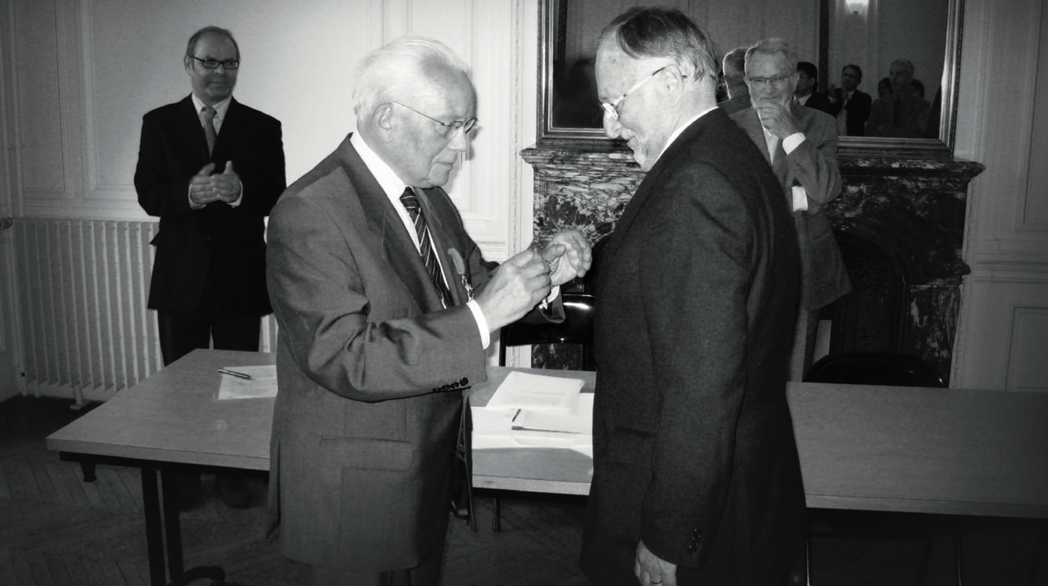 20 septembre 2007, cérémonie de remise de la Légion d’honneur. Daniel Bouchez reçoit la prestigieuse distinction des mains de M. René Knockaert. À gauche, M.Alain Delissen, directeur d’études à l’École des hautes études en sciences sociales. En arrière-plan Marc Orange, ancien directeur de l’Institut d’études coréennes du Collège de France.