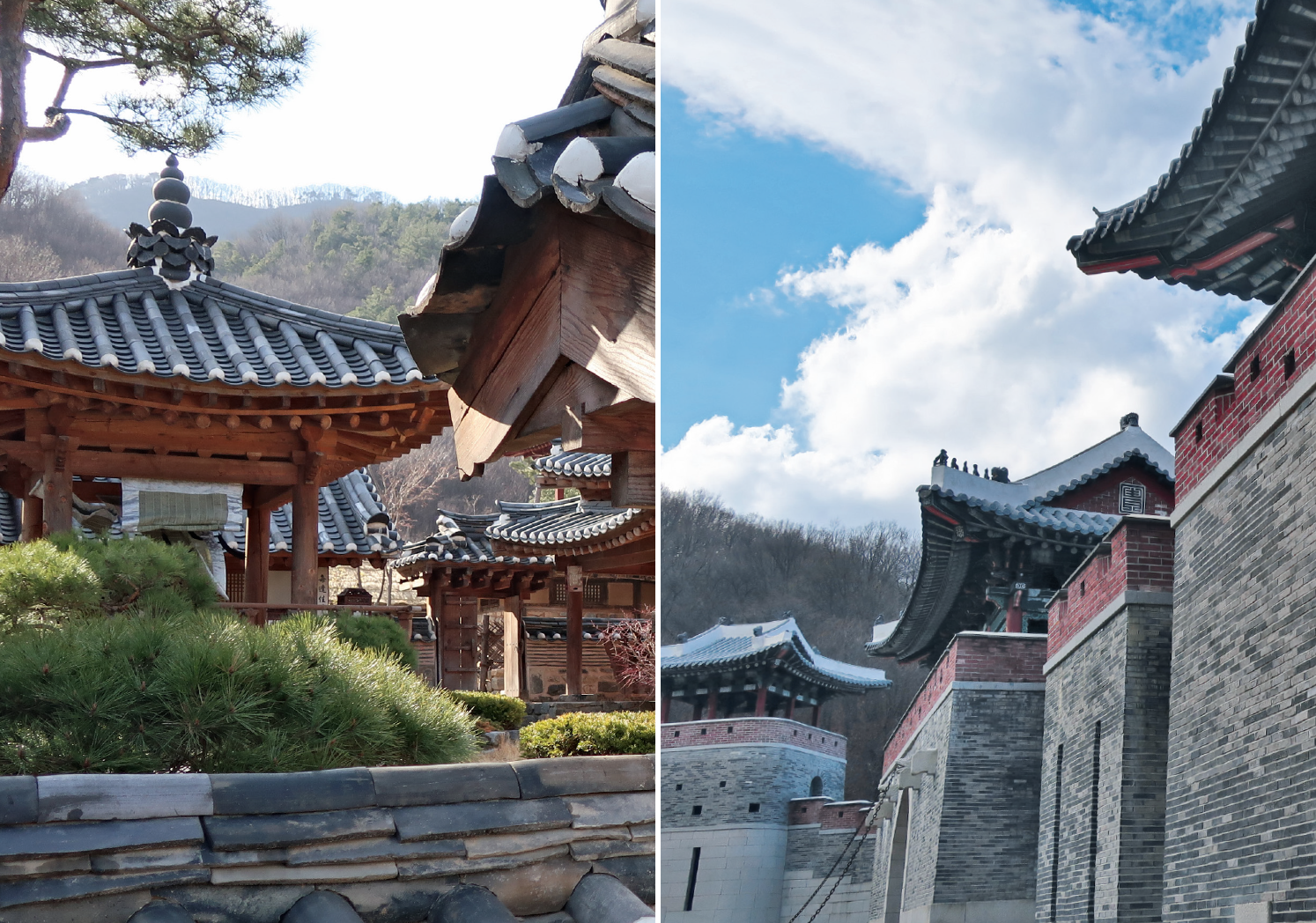 Le Dae Jang Geum Park a déjà reçu plus de cent tournages historiques. D’où son allure d’encyclopédie de l’architecture. Epoques et styles se bousculent. Dentelles aériennes de palais de Silla (VIe s.) et donjons massifs médiévaux s’accrochent à flanc de montagne. Le granite de la tour tutoie le balsa peint d’un muret qui perd ses tripes.