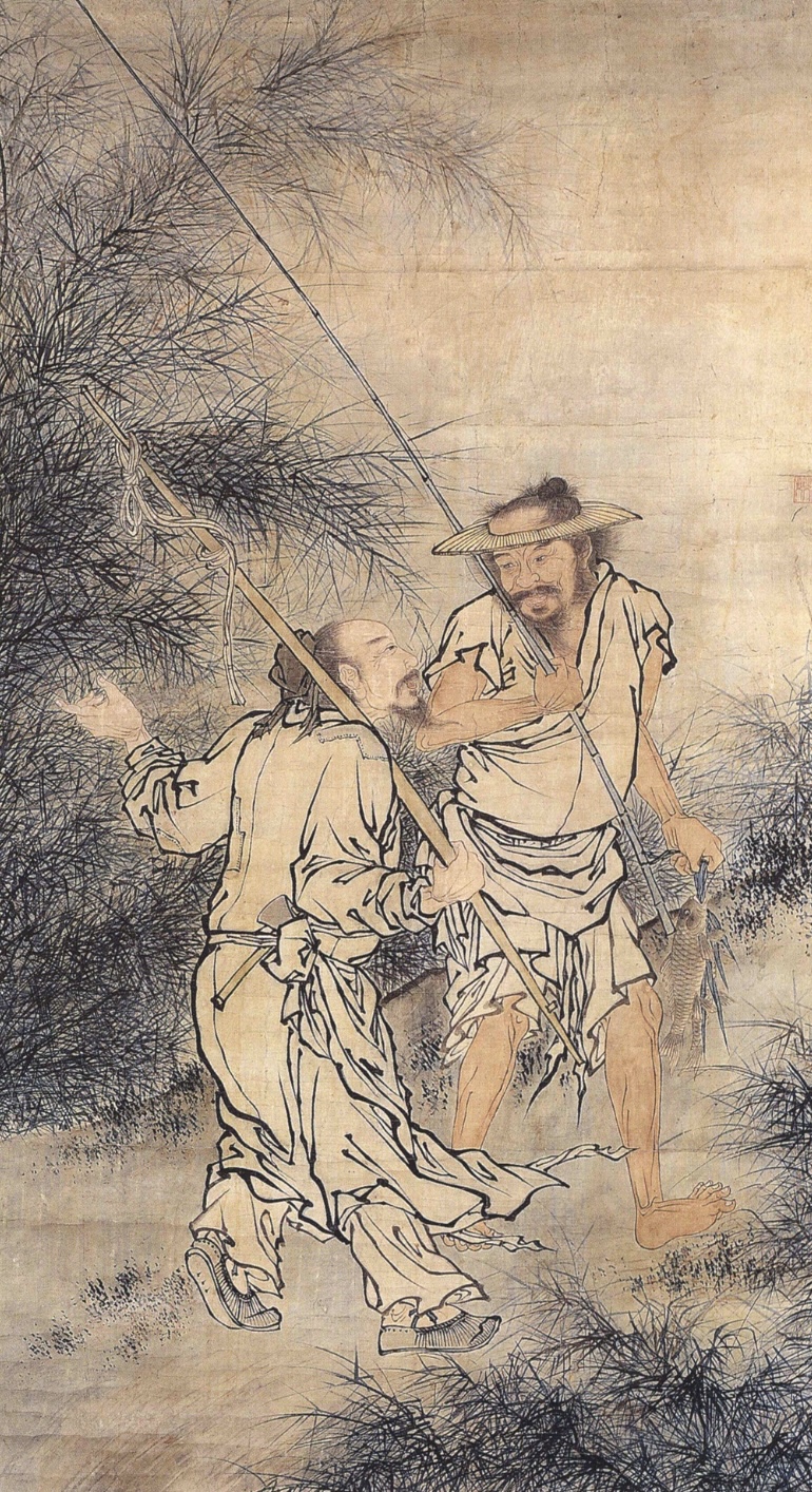 Contrairement à An Gyeon, qui était un peintre de l’Académie, le deuxième peintre remarquable de cette période, Gang Hui-an (1417-1464), était un lettré qui a par ailleurs participé à la création de l’alphabet coréen au sein du Jiphyeunjeon. La composition et le style de sa peinture « Éminent lettré contemplant l’eau » (1455) évoquent le style de l’école de Zhe qui a prospéré pendant la dynastie chinoise des Ming, et qu’il a certainement pu admirer lorsqu’il est allé à Pékin en 1445 en qualité d’ambassadeur adjoint. Cette école a préféré placer une falaise ou un grand arbre d’un côté de la composition et figurer des hommes en contrebas, au lieu de représenter une nature grandiose dominant des hommes minuscules. Un fort contraste dans les nuances de l’encre et une rapidité dans les coups de pinceau caractérisent également cette école. Ce style connaît ensuite un engouement croissant au milieu du Joseon et est à l’origine de chefs-d’œuvre comme ceux du peintre lettré Kim Si (1524-1593) (fig. 3) ou encore ceux de Kim Myeong-guk (1600 ? -1663). Ce dernier a connu un énorme succès lorsqu’il est parti au Japon en 1636 et en 1643, en tant que peintre de l’ambassade. Il y avait à l’époque nombre d’autres peintres renommés, chacun spécialiste dans son domaine : les animaux pour Yi Am (1499 - ?), les oiseaux pour Jo Sok (1595-1668), les bambous pour Yi Jeong (1544-1626), les personnages pour Yi Myeong-uk (? - 1713 ?) (fig. 8), etc.