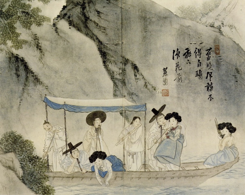 (fig. 10) Shin Yun-Bok, Promenade en bateau, « Album de peinture de genre de Hyewon », fin du 18e siècle, encre sur papier, 28,2 cm x 35,2 cm, Musée Gansong, Séoul.