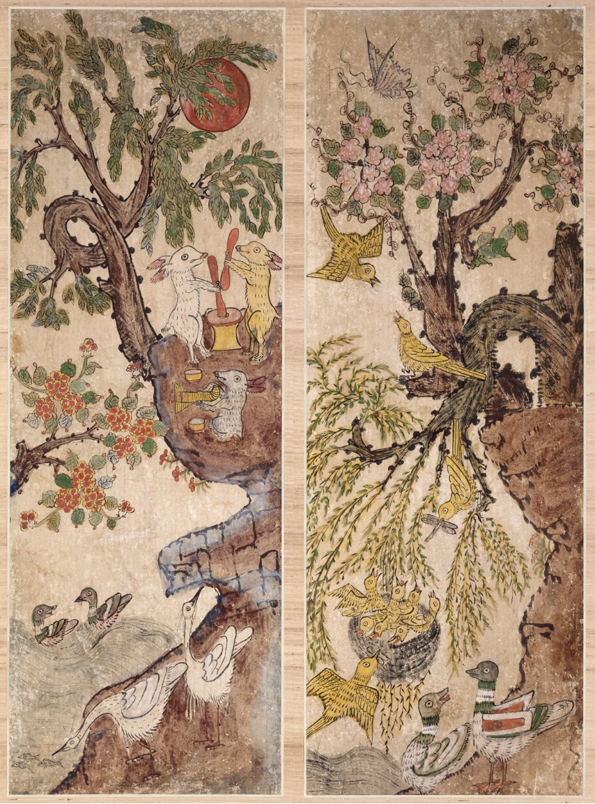 (fig. 12) Fleurs, oiseaux et lapins, Joseon, XIXe siècle, paravent à six panneaux, couleurs sur papier, h 102 cm x L 35,5 cm, Musée Guimet, Paris.