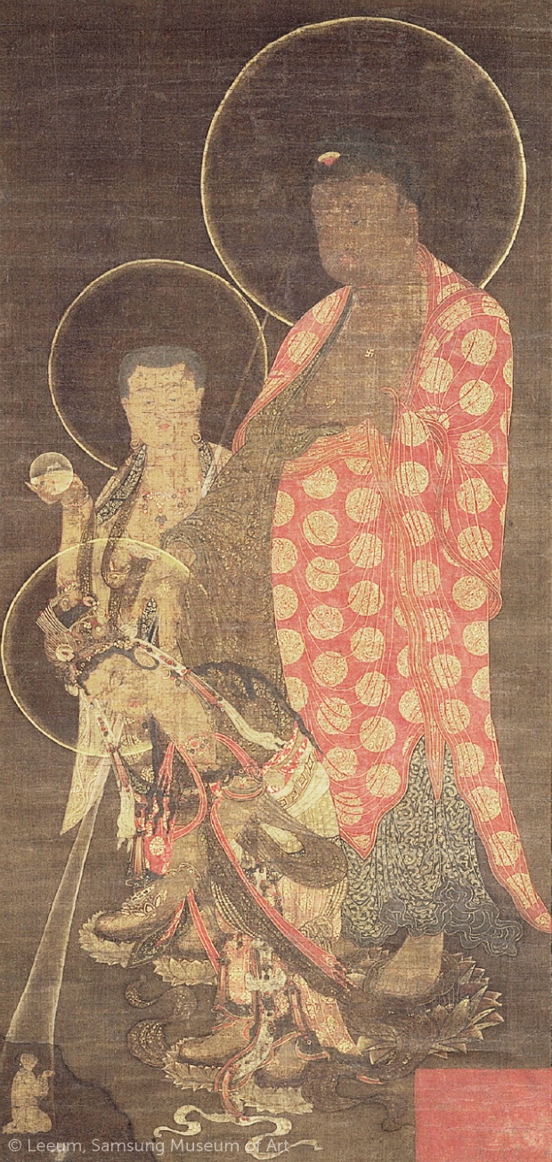 « La descente d’Amitabha » décrit le Bouddha de la « Terre Pure du Paradis de l’Ouest » y accueillant l’âme des fidèles. L’apparition dans le bouddhisme d’un Bouddha de l’au-delà tel qu’Amitabha, correspondait à un désir profond chez les hommes d’être rassurés quant à leur devenir après la mort, particulièrement durant cette période de Goryeo très bouleversée par une succession de guerres. Amitabha est souvent accompagné par deux Bodhisattvas, qui sont des « êtres destinés à l’Éveil ». Pouvant être considérés comme les égaux des Bouddhas, ceux-ci ont renoncé à l’état ultime par pure compassion envers tous les êtres. Dans la « Triade d’Amitabha » du musée Leeum à Séoul (fig. 4), le Bouddha est escorté, à sa gauche, d’Avalokitesvara (Gwaneum bosal), le Boddhisattva qui incarne la toute-compassion d’Amitabha et, à sa droite, de Ksitigarbha (Jijang bosal), le Boddhisattva guide et sauveur des âmes tombées en enfer. La présence de Ksitigarbha dans la Triade d’Amitabha est une exception, car c’est d’habitude Mahasthamaprapta qui accompagne ce Bouddha. Cette œuvre rassemble, de ce fait, les trois figures bouddhiques les plus populaires de l’époque. L’Amitabha illumine, avec la lumière venant de l’urna de son front, l’âme d’un fidèle minuscule situé à l’extrémité de la peinture. Quant à Avalokitesvara, il se penche soigneusement pour accueillir cette âme juste éteinte dans un socle de fleur de lotus.