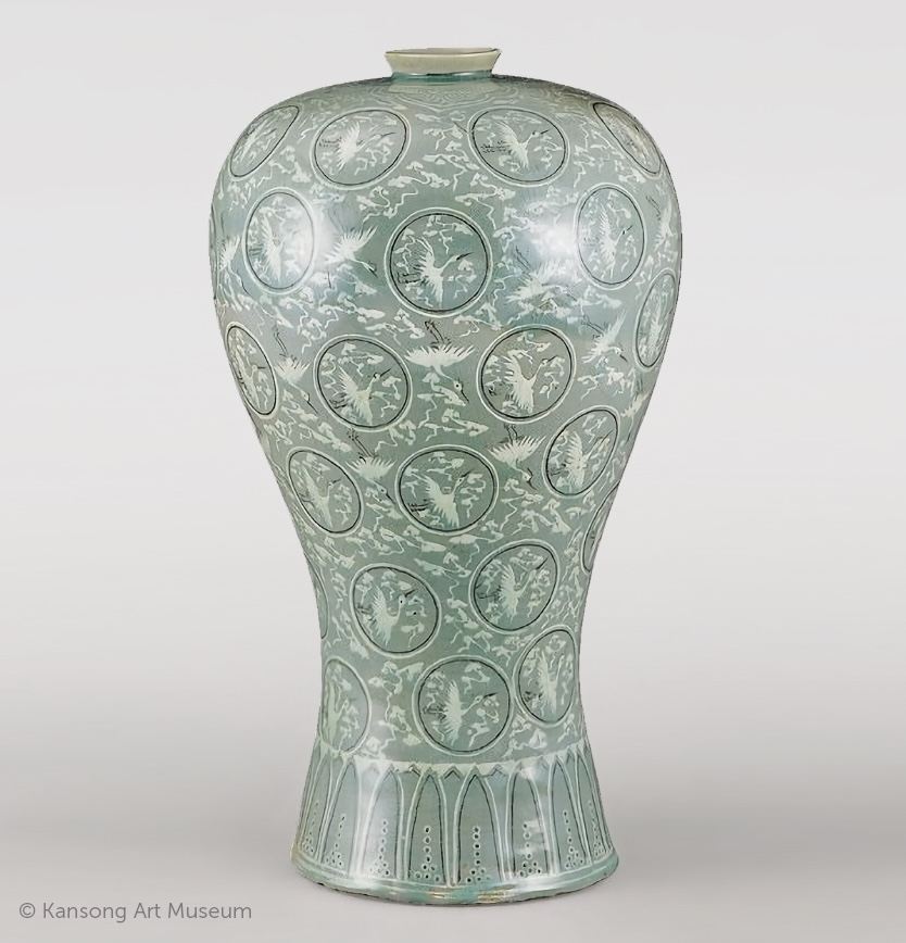 (fig. 6) Céladon incrusté aux grues volant à travers les nuages, Goryeo, hauteur 41,7 cm, trésor national n° 68, Musée Gansong.