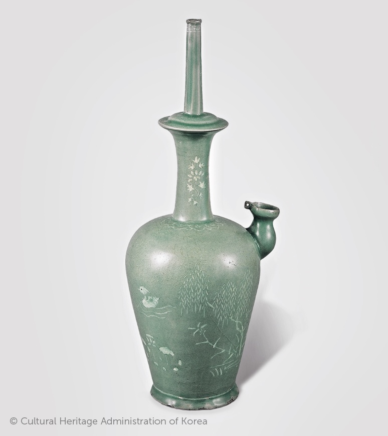 (fig. 7) Kundika (verseuse rituelle), couverte céladon, décor incrusté, Goryeo, hauteur 37,2 cm, trésor national n° 66. MuséeGansong.