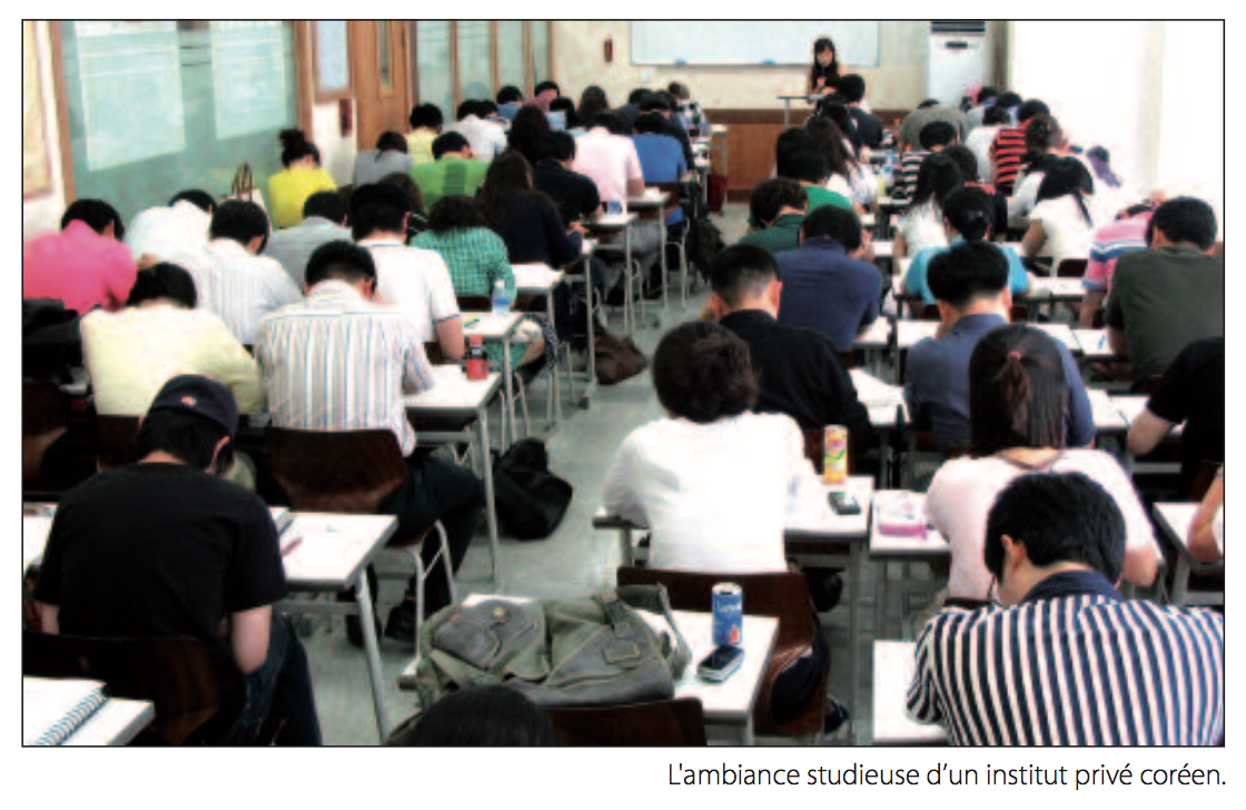 Hier pays de lettrés, aujourd’hui pays de docteurs, la Corée a, depuis toujours, accordé une place primordiale à l’éducation. Faire de longues études et soutenir une thèse en lettres ou en sciences, c’est presque banal en Corée du Sud où le nombre de personnes détentrices d’un doctorat est particulièrement élevé. Les parents coréens caressent tous le même rêve : celui de faire de leurs enfants des docteurs. En effet, atteindre l’excellence est l’objectif et, cet objectif étant le même pour tous, la concurrence qui en résulte est féroce. Dès leur plus jeune âge, les enfants n’ont d’autre obligation que celle d’apprendre encore et encore pour faire mieux que les autres. Les autres, c’est là que se focalise l’attention. Une étude a montré, à partir d’examens comparatifs d’encéphalogrammes, qu’une mère coréenne n’était satisfaite que si elle pouvait constater que son enfant avait obtenu de meilleurs résultats que ses camarades de classe tandis qu’une mère américaine se contentait de considérer les notes attribuées sans chercher à établir de comparaisons. L’obligation en Corée est de surtout ne pas se laisser dépasser et d’être le premier. L’escalade infernale - que tout le monde déplore en paroles - n’a pas pu être évitée. D’une soif « raisonnable » de connaissances, on est passé à une course « déraisonnable » aux connaissances. Déraisonnable dans le sens où la quantité l’emporte sur la qualité ; la mémorisation sur la réflexion.