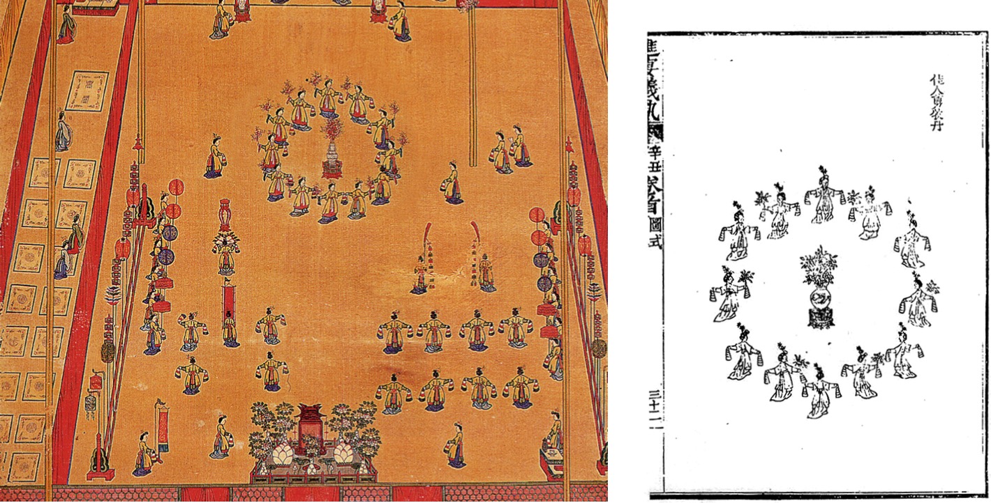 Danse de cour Gainjeonmokdan (Danse des Pivoines) exécutée en l’honneur du roi Kojong en 1902, représentée dans le livre Jinyeondobyeong et consignée dans le Sinchuk Jinyeon Uigwe (à droite).
