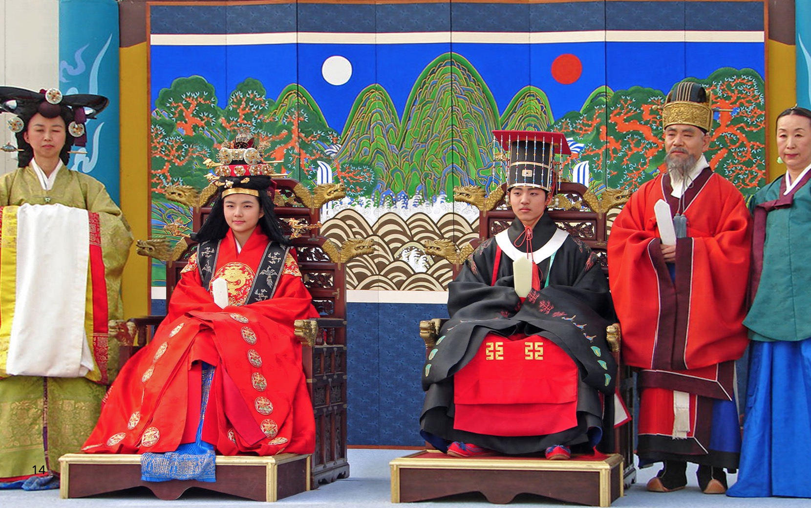 Reconstitution de la cérémonie de mariage du roi Kojong, âgé de 13 ans, et de la reine Min, 14 ans, qui eut lieu le 21 mars 1866.