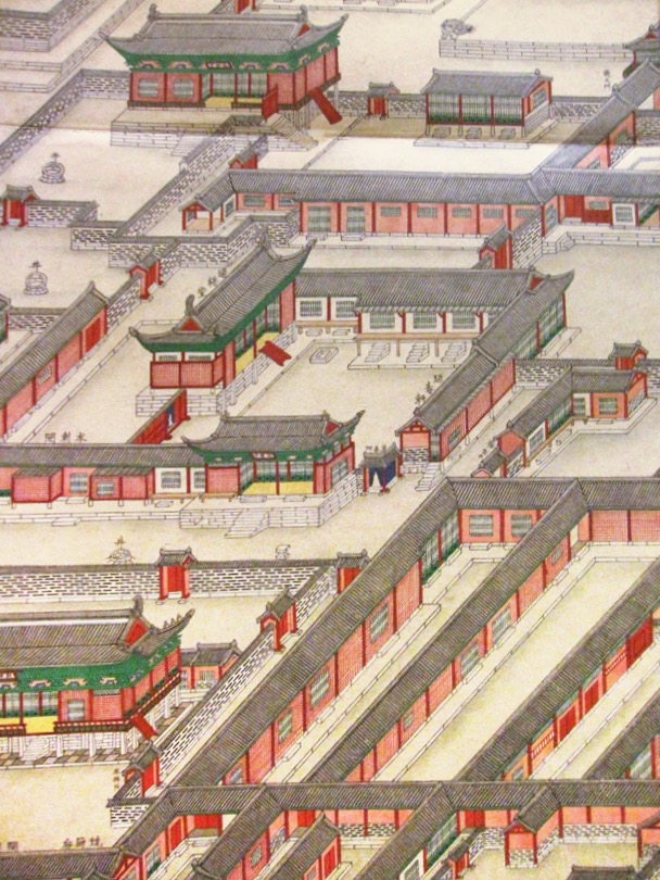 Les mêmes processions se retrouvent pour l’arrivée des émissaires chinois, venus rendre hommage au souverain défunt et accomplir les rites funéraires dans le palais Changdeok. On les voit arriver au palais escortés d’officiels coréens en grande pompe, précédés par le chef des eunuques monté sur un fier destrier. Les protocoles illustrent aussi les scènes de musique et de danse, les banquets officiels, notant à l’occasion les paravents qui servent de décor, notamment celui qui évoque les « dix symboles de longévité », un thème spécifique à la Corée Joseon, inconnu en Chine et au Japon, mais également le thème des livres et des bibliothèques, « Chaekkado », celui des paysages et des calligraphies, « munbangdo », voire celui de la retraite heureuse du général Guo Ziyi noté sur les inventaires du palais pour la première fois l’année 1802, cela sans oublier des thèmes plus classiques, comme celui des « fleurs et des oiseaux », « Hwajodo », ou celui des « pivoines et des rocs », « morando ». Le Musée National du Palais qui conserve le souvenir de cette vie de cour en présente quelques très beaux exemples et les toutes premières photographies montrent que le roi ne dédaigne pas parfois de se faire portraiturer devant. Seize albums, aujourd’hui au musée de l’université Koryo, donnent une idée du cadre de vie, dressant une vue panoramique du palais Changdeok à Séoul, « Dongwoldo ». Celle-ci permet de mieux réaliser l’immense superficie couverte avec son accumulation de pavillons résidentiels et officiels, de cours et de jardins, de lacs et de rivières, cela sans oublier le bâtiment de la bibliothèque royale que fit bâtir, en 1776, un monarque lettré comme Chongjo (r. 1776-1800), dans le « palais de derrière », l’actuel « Piwon » - qui avait tant frappé Pierre Loti par son caractère bucolique.